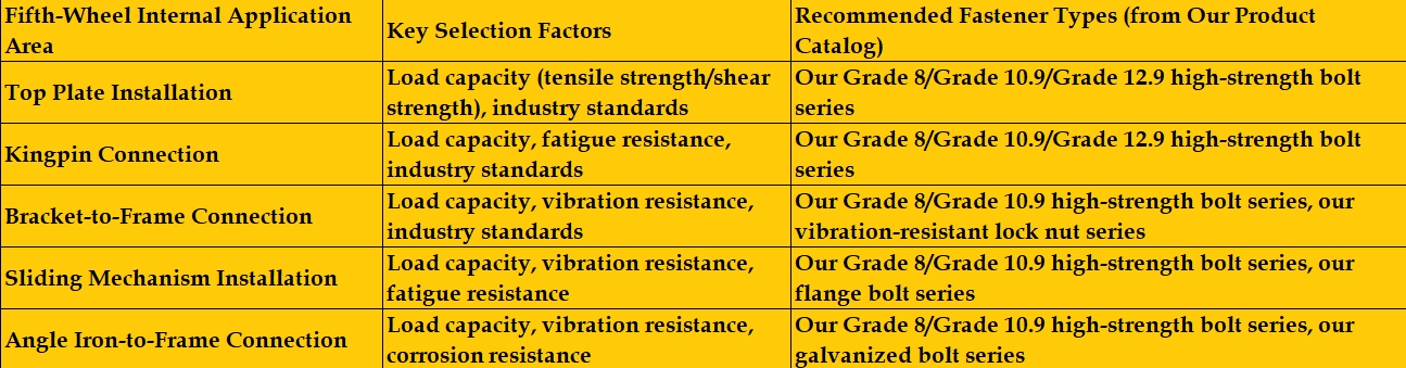 Systém pátého kola hraje klíčovou roli při připojení traktoru a přívěsu, který je nezbytný pro bezpečnou a efektivní přepravu. Správný výběr příslušných spojovacích prostředků je zásadní pro integritu a životnost tohoto spojení, přímo ovlivňující bezpečnost a provozní spolehlivost. Cílem tohoto zpravodaje je vést zákazníky na základě katalogu produktu naší společnosti prostřednictvím klíčových faktorů, které je třeba zvážit při výběru spojovacích prostředků pro aplikace pátého kola.